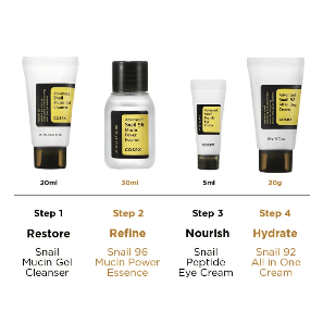 Το COSRX All About Snail Kit διαθέτει τα καλύτερα σε πωλήσεις προϊόντα της CORSX με έκκριμα σαλιγκαριού. Γνωστή για τις ενυδατικές της ιδιότητες, η βλεννίνη σαλιγκαριού βοηθά επίσης στη μείωση της εμφάνισης μαύρων κηλίδων, πανάδων και ουλών ακμής.